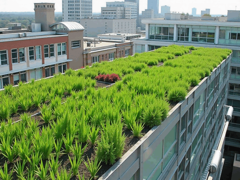 “Telhados Verdes: Harmonia entre metal e natureza.”